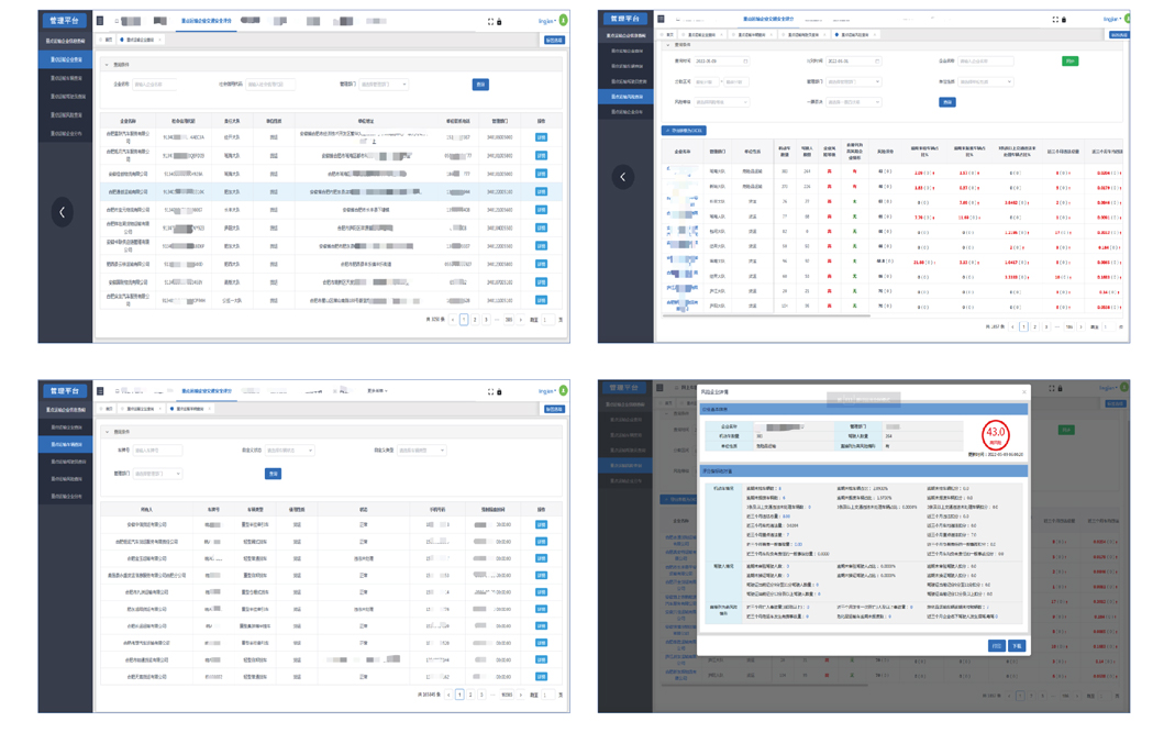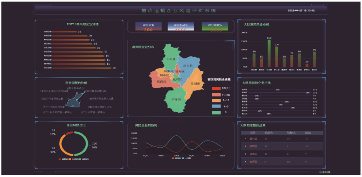 爲提升全國(guó)重點運輸企業風(fēng)險管理(lǐ)的科(kē)學性、針對性、有效性,做到對重點運輸企業進行客觀評價和風(fēng)險精準預警,我司研發的減量控大(dà)”重點運輸企業風(fēng)險評估系統,根據制定的交通安全風(fēng)險評估對企業交通安全風(fēng)險進行評分(fēn),并按評分(fēn)結果劃分(fēn)爲高中低三個風(fēng)險等級,對重點運輸企業進行風(fēng)險畫(huà)像分(fēn)析。
