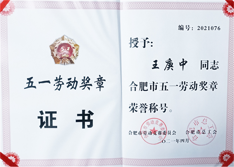 喜報!超遠(yuǎn)信息員(yuán)工(gōng)王庚中榮獲“合肥市五一勞動獎章(zhāng)”