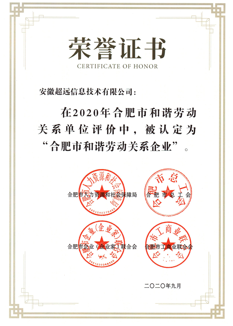 在2020年(nián)合肥市和諧勞動關系單位評比中,超遠(yuǎn)信息被成功認定爲“合肥市和諧勞動關系企業”。超遠(yuǎn)信息将繼續踐行以人(rén)爲本的經營理(lǐ)念,關注員(yuán)工(gōng)認同與幸福感,積極承擔社會責任,切實把促進勞資利益均衡和實現共赢發展相(xiàng)結合,争當和諧企業排頭兵(bīng),爲推動合肥市建設“大(dà)湖名城(chéng)、創新高地”添磚加瓦,繼續抒寫新篇章(zhāng)。